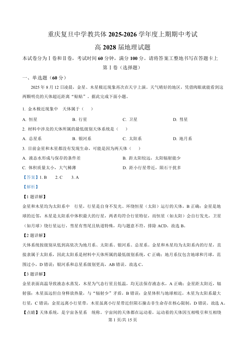 高一地理(解析版)--重庆市复旦中学教共体2025-2026学年高一上学期第二次段考